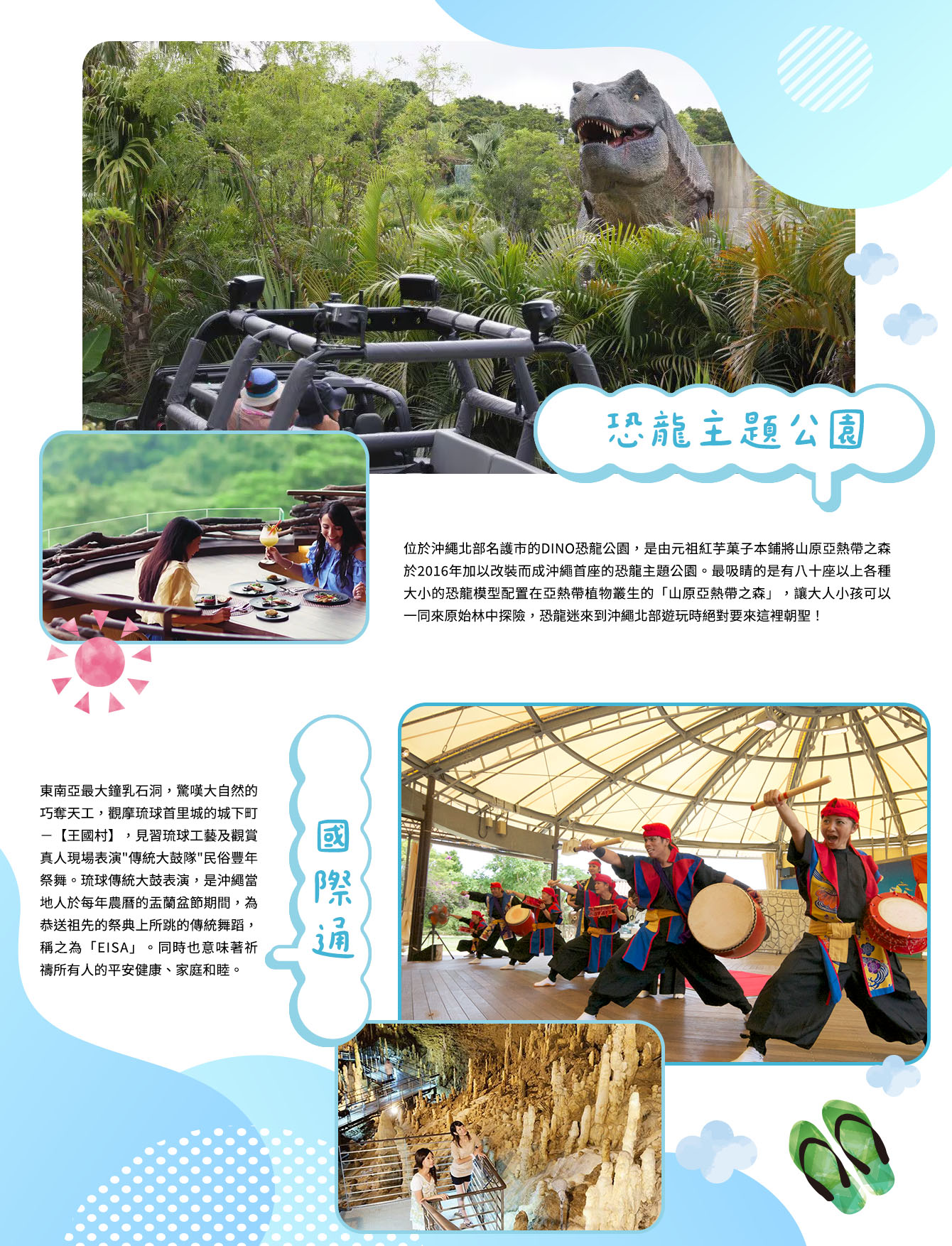 東南亞最大鐘乳石洞,觀賞95萬支的各式石筍天然鐘乳石,驚嘆大自然的巧奪天工,觀摩琉球首里城的城下町-【王國村】,見習琉球工藝、民藝、手藝傳統的藝能場-製陶瓷場、玻璃工場、製酒場、製黑糖工場、王朝時代的織布染布工場、古代的木屋、朝貢船、熱帶果樹園及觀賞真人現場表演"傳統大鼓隊"民俗豐年祭舞。琉球傳統大鼓表演,是沖繩當地人於每年農曆的盂蘭盆節期間,為恭送祖先的祭典上所跳的傳統舞蹈,稱之為「EISA」。同時也意味著祈禱所有人的平安健康、家庭和睦。