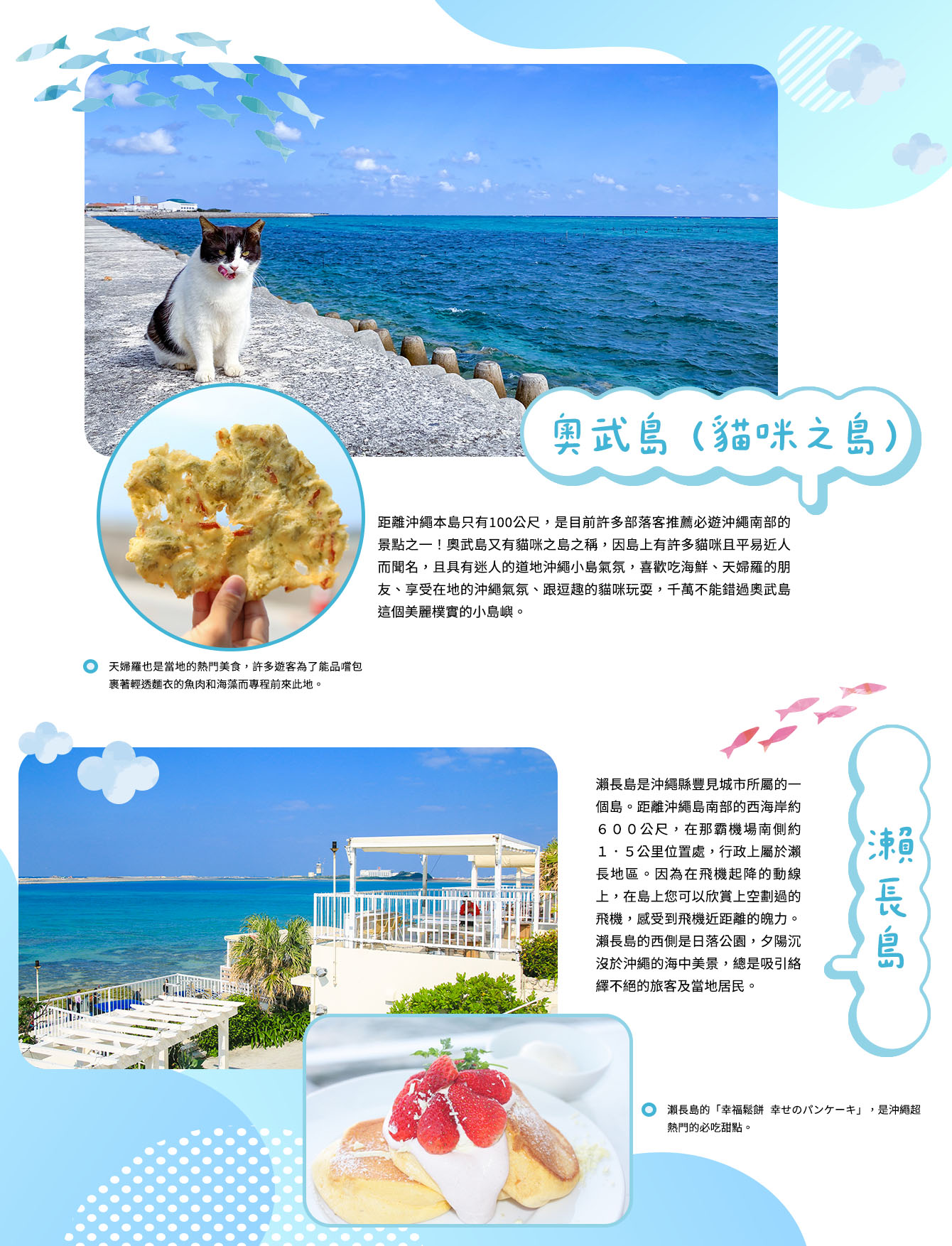 距離沖繩本島只有100公尺,是目前許多部落客推薦必遊沖繩南部的景點之一!奧武島又有貓咪之島之稱,因島上有許多貓咪且平易近人而聞名,且具有迷人的道地沖繩小島氣氛,喜歡吃海鮮、天婦羅的朋友、享受在地的沖繩氣氛、跟逗趣的貓咪玩耍,千萬不能錯過奧武島這個美麗樸實的小島嶼。