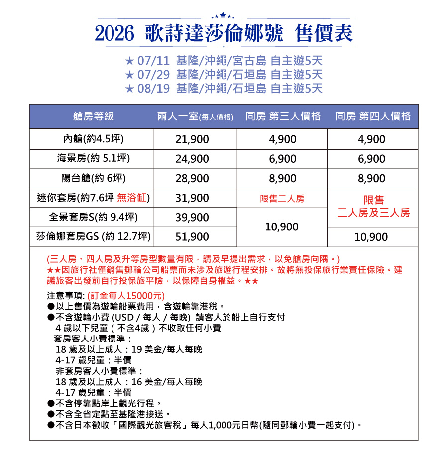 ◎18歲以下未成年小孩:所有年齡未滿 18 歲小孩不可單獨參加任何航程。『每間艙房至少需1位年滿18歲成年人』
