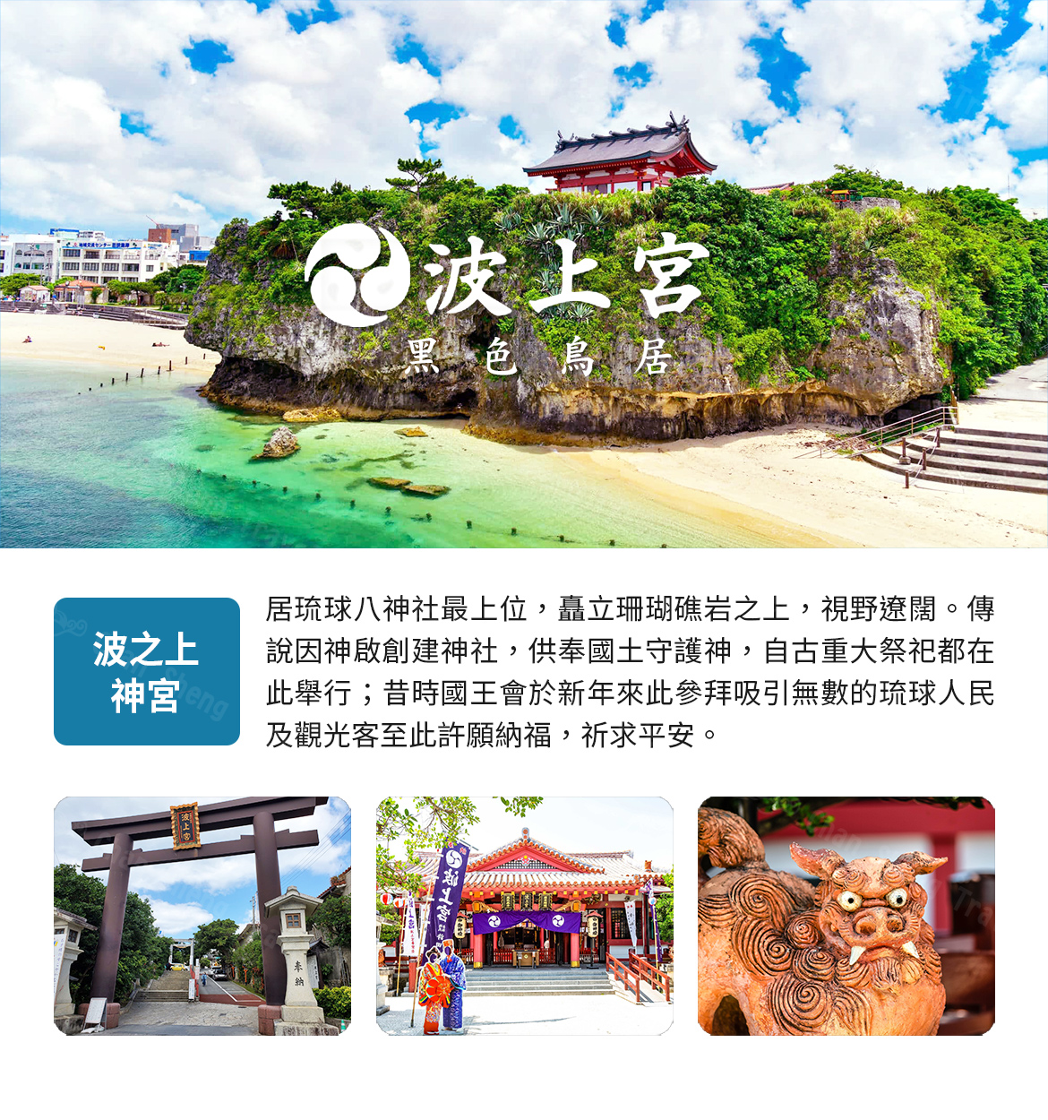 沖繩八社之首~海灘上的絕美神社~波之上神宮→日本三大鐘乳石洞之一《玉泉洞》→琉球文化主題園區《王國村》琉球大鼓秀表演→世界文化遺產《守禮門.首里城》(不入內)→飯店
