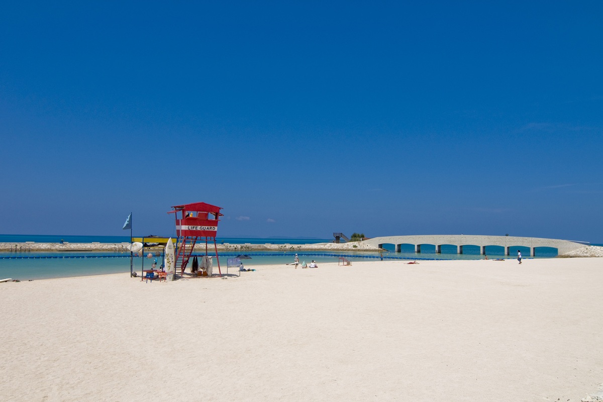是沖繩南部最受歡迎的人氣海灘之一。潔白細緻的人工沙灘搭配清澈湛藍的海水,環境整潔舒適,非常適合悠閒度假與水上活動體驗。