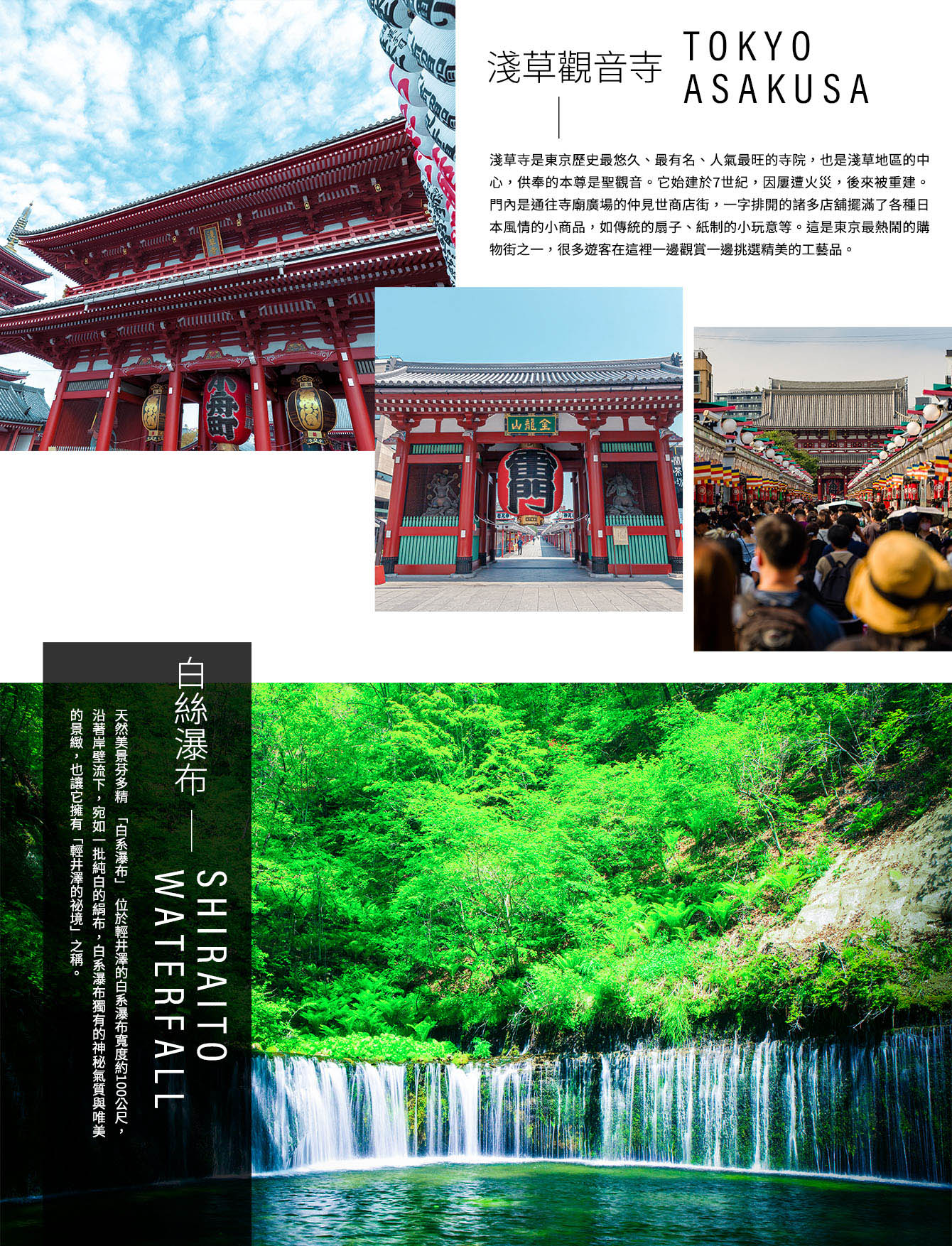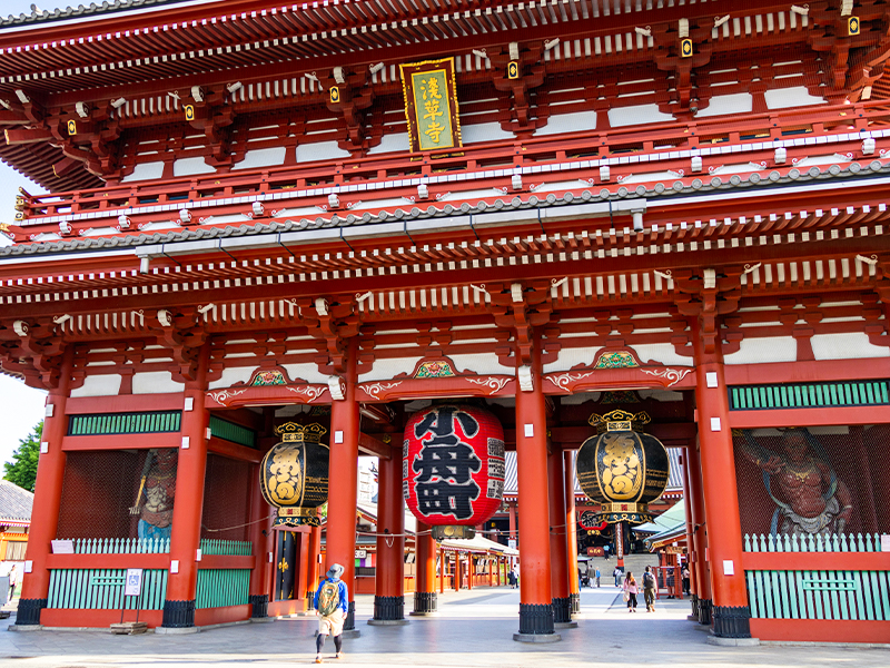 【淺草觀音寺】正式名稱是金龍山淺草寺,同時也是聖觀音宗的總本山,創立於西元7世紀,寺內供奉觀世音菩薩為主,是東京都內最古老的寺廟。在西元1945年曾經被燒毀,重建於西元1958年。大門上懸掛100公斤,書寫「雷門」二字的巨型燈籠,寺前是寶藏門,據說其中一道門的頂端藏有寺廟寶藏,旁邊五重塔高達64公尺左右,建於天慶5年(公元942年),原是木造,後被大火燒毀。慶安元德家光重建,但在二次大戰時再度燒毀,昭和48年11月重建。