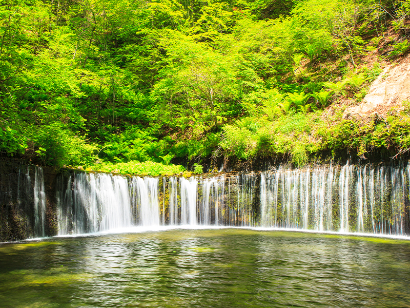 【輕井澤三大觀光名勝之一.白絲瀑布】天然美景芬多精 「白系瀑布」 位於輕井澤的白系瀑布寬度約100公尺,沿著岸壁流下,宛如一批純白的絹布,白系瀑布獨有的神秘氣質與唯美的景緻,也讓它擁有「輕井澤的祕境」之稱。