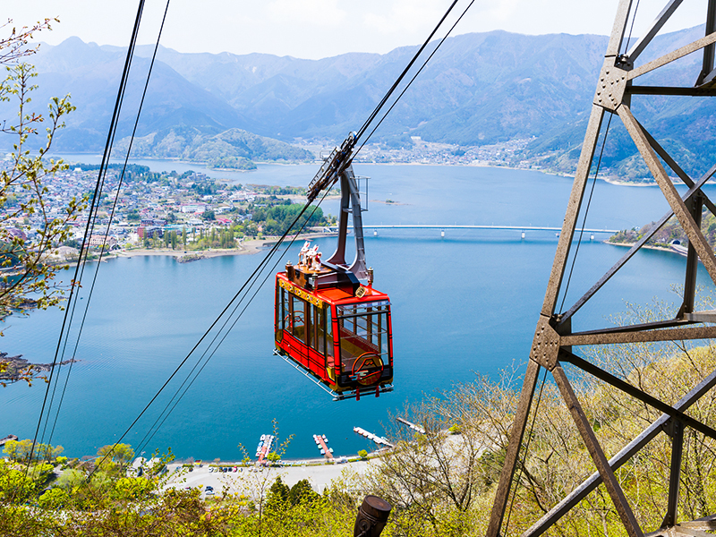 【富士山瞭望纜車 (絕景展望迴廊、展望高台) 】在天上山纜車的山頂能欣賞到富士山與下方河口湖令人讚嘆的美景。搭乘富士山全景纜車,前往山頂的觀景台,參加以當地民間故事為背景的活動,以及欣賞周圍美不勝收的景觀。