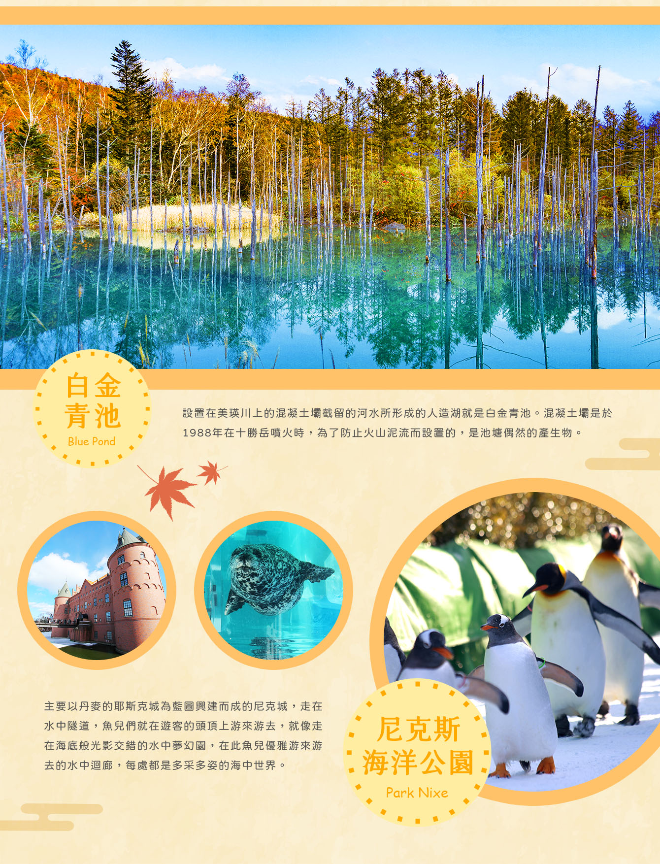 【登別海洋公園尼克斯】主要以丹麥的耶斯克城為藍圖興建而成的尼克城,走在水中隧道,魚兒們就在遊客的頭頂上游來游去,就像走在海底般光影交錯的水中夢幻園,在此魚兒優雅游來游去的水中迴廊,每處都是多采多姿的海中世界。城的四周都是北歐式的街景,還可以看到可愛的海豚精采的表演、國王企鵝遊行、街頭藝人演出等。