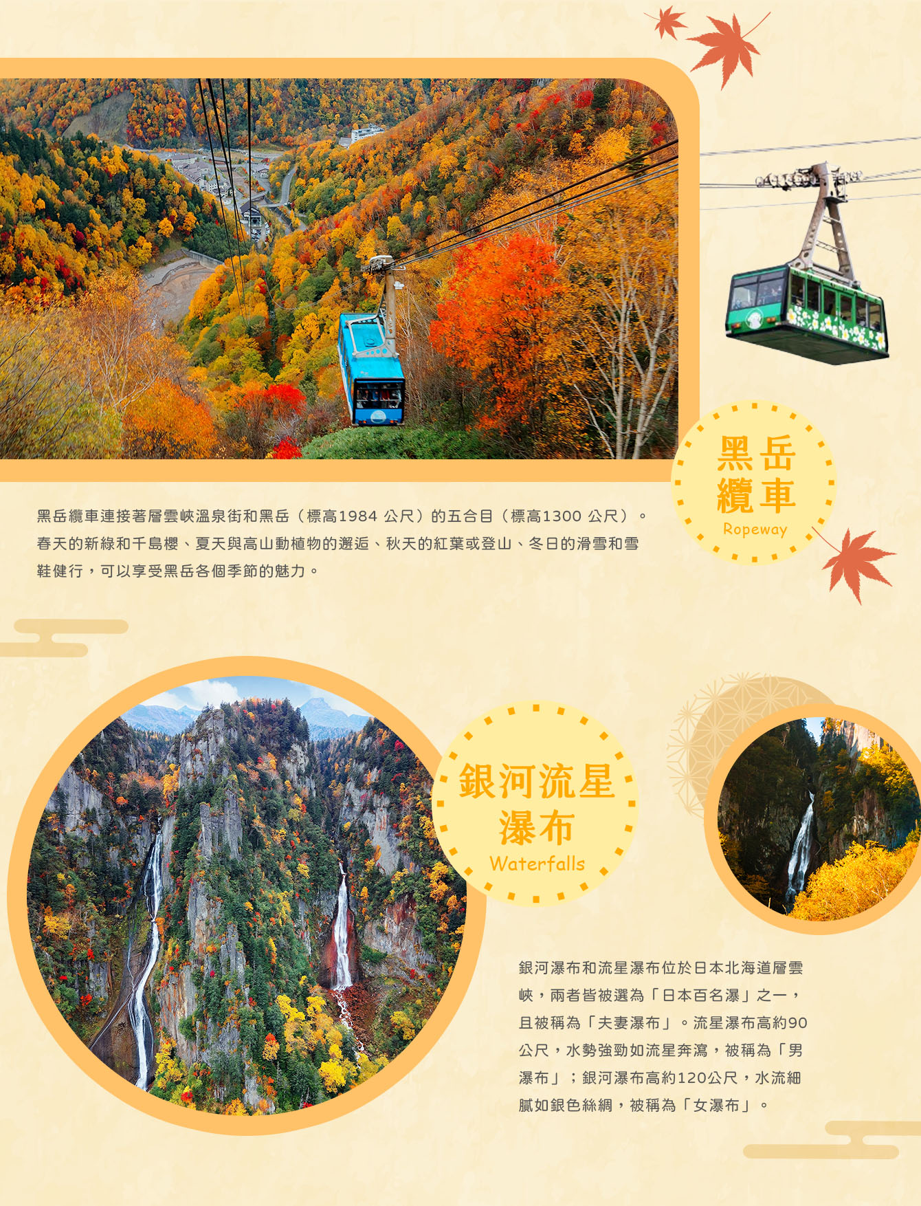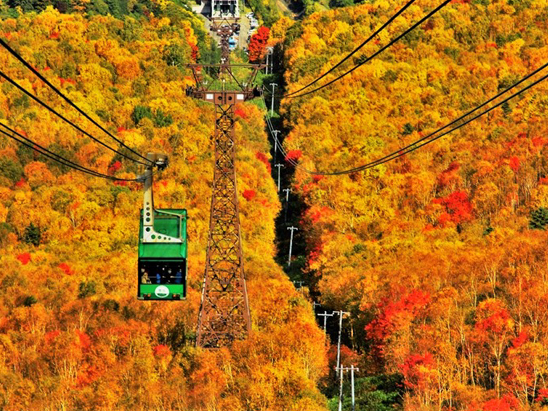 【大雪山黑岳纜車】黑岳纜車連接著層雲峽溫泉街和黑岳(標高1984 公尺)的五合目(標高1300 公尺)。 春天的新綠和千島櫻、夏天與高山動植物的邂逅、秋天的紅葉或登山、冬日的滑雪和雪鞋健行,可以享受黑岳各個季節的魅力。 黑岳站周邊有一條全程約30 分鐘的散步道,途中有看得到山頂的展望台和資料館,還能一邊散步一邊欣賞美麗的高山植物。