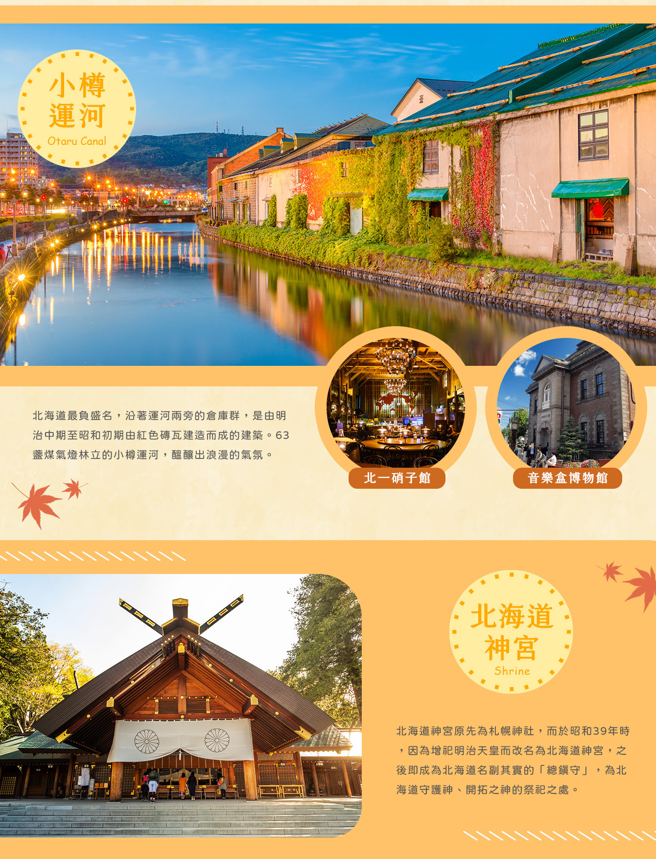 【小樽運河】最負盛名,沿著運河兩旁的倉庫群,是由明治中期至昭和初期由紅色磚瓦建造而成的建築。63盞煤氣燈林立的小樽運河,醞釀出浪漫的氣氛。