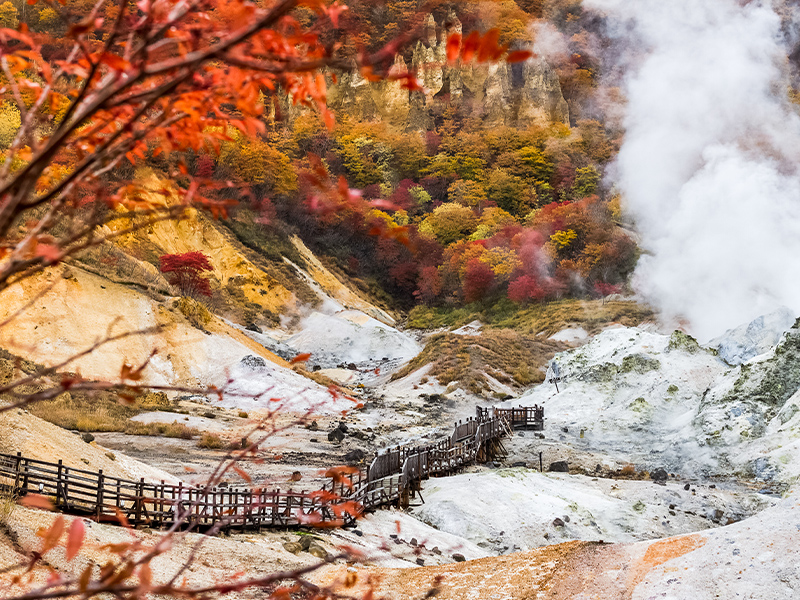 【登別地獄谷】位於登別溫泉街的東北側,是約1萬年前發生的笠山爆發所形成的噴火口,溫泉的出水量每分鐘高達3000立方公升,為登別最大的泉源,依地點不同,湧出之源泉水質亦不相同,可達11種之多。
