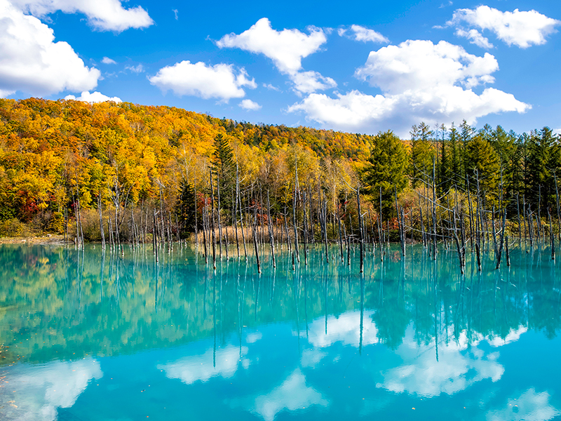 【白金青池】設置在美瑛川上的混凝土壩截留的河水所形成的人造湖就是白金青池。混凝土壩是於1988年在十勝岳噴火時,為了防止火山泥流而設置的,是池塘偶然的產生物。讓人著迷的魅力藍色,其實並不是池塘原本的顏色,是由上流白金溫泉區所湧出富含氫氧化鋁的泉水與美瑛川的河水混合而成,呈現膠體狀(粒子分散在液體中的狀態),這些粒子反射陽光,波長較短、容易散射的藍色色光被瞳孔所接收,才會看成藍色。