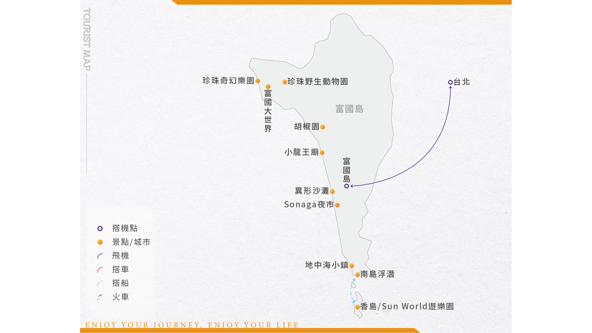 今日集合於桃園國際機場,搭乘客機飛往越南第一大島『富國島』。抵達富國島國際機場後,辦理通關手續,熱情的華語導遊正在迎接各位的到來,隨即帶領各位貴賓展開富國島度假生活的序幕。