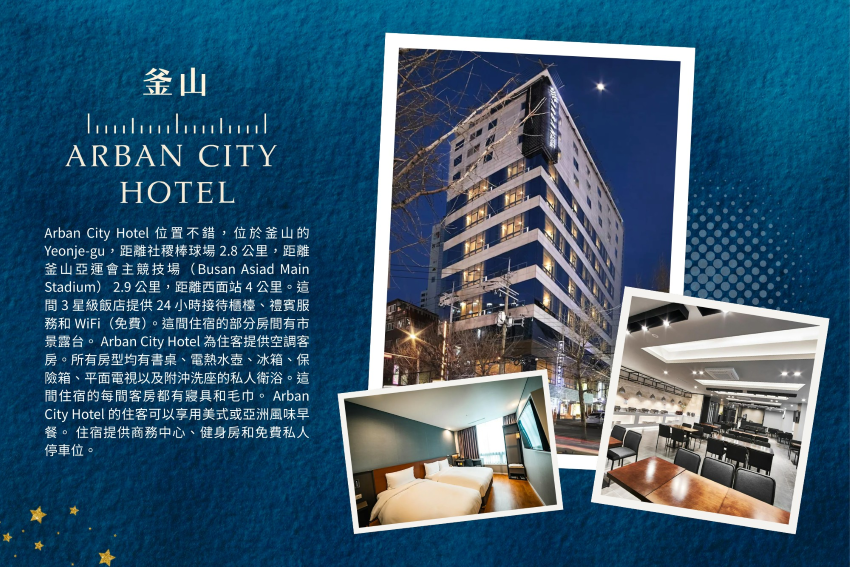 住宿:ARBEN CITY 或 SEATTLE B HOTEL 或 釜山TT(龜浦或西面) 或 釜山MARON HOTEL(南浦站) 或 GRIFFIN BAY HOTEL(南浦洞 ) 或 釜山CONNECT OCEAN HOTEL(南浦站)或 釜山COTICE THE GROUND HOTEL(南浦洞)或 CITADINES CONNECT HARI 或 ARBEN HOTEL 或 BUSN CITY HOTEL 或 NO.25 HOTEL 或 THE KING HOTEL 或同級