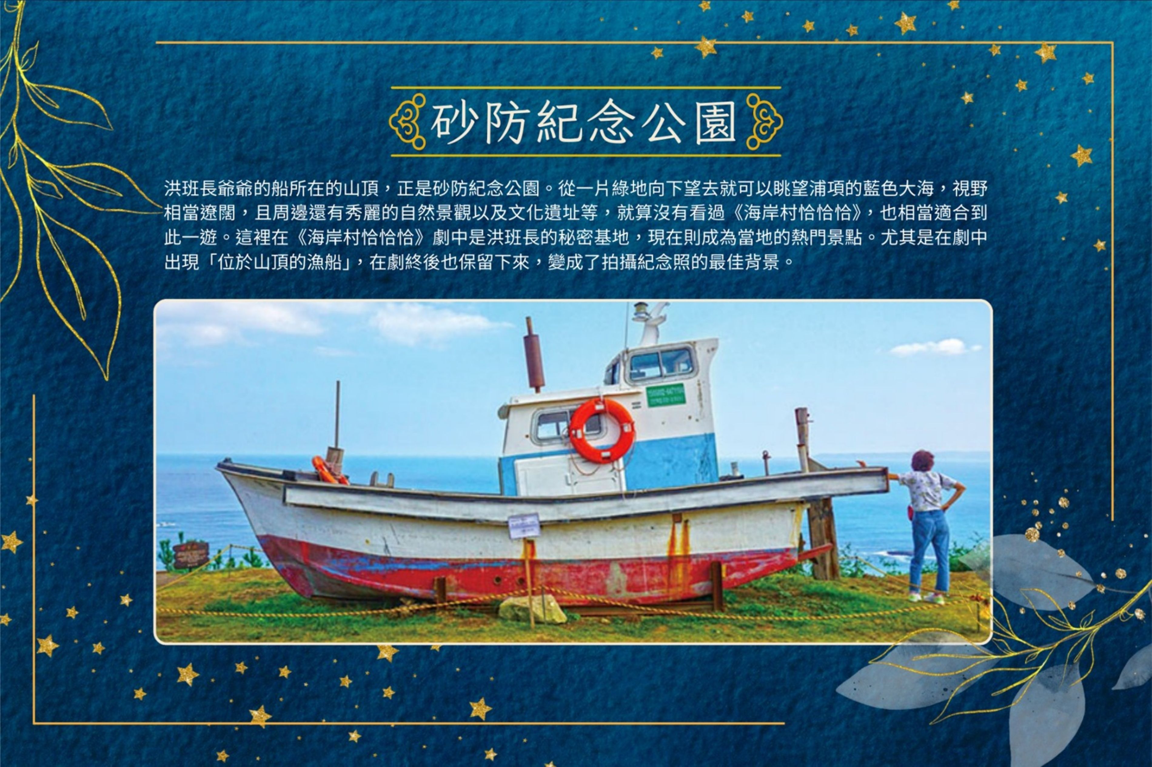 【砂防紀念公園(位於山頂的漁船)】洪班長爺爺的船所在的山頂,正是砂防紀念公園。從一片綠地向下望去就可以眺望浦項的藍色大海,視野相當遼闊,且周邊還有秀麗的自然景觀以及文化遺址等,就算沒有看過《海岸村恰恰恰》,也相當適合到此一遊。這裡在《海岸村恰恰恰》劇中是洪班長的秘密基地,現在則成為當地的熱門景點。尤其是在劇中出現「位於山頂的漁船」,在劇終後也保留下來,變成了拍攝紀念照的最佳背景。清河市場(公辰市場) : 吳允咖啡廳、寶拉超市和清湖五金行等公辰海岸村居民們的日常生活都在公辰市場發生, 這裡實際上正是位於浦項的清河市場。市場正中央的公辰市場魷魚銅像仍保持劇中當時的樣子,走在散發著淳樸小鎮氣息的清河市場,耳邊似乎就響起了劇中常出現的《浪漫星期天(로맨틱 선데이)》主題曲配樂,讓人彷彿也成為劇中的一角。另外, 劇中所出現的吳允咖啡廳,原本是一座生產鋁製品的工廠,必須等到工廠營業結束後,才能拍出原本劇中咖啡廳的外觀。