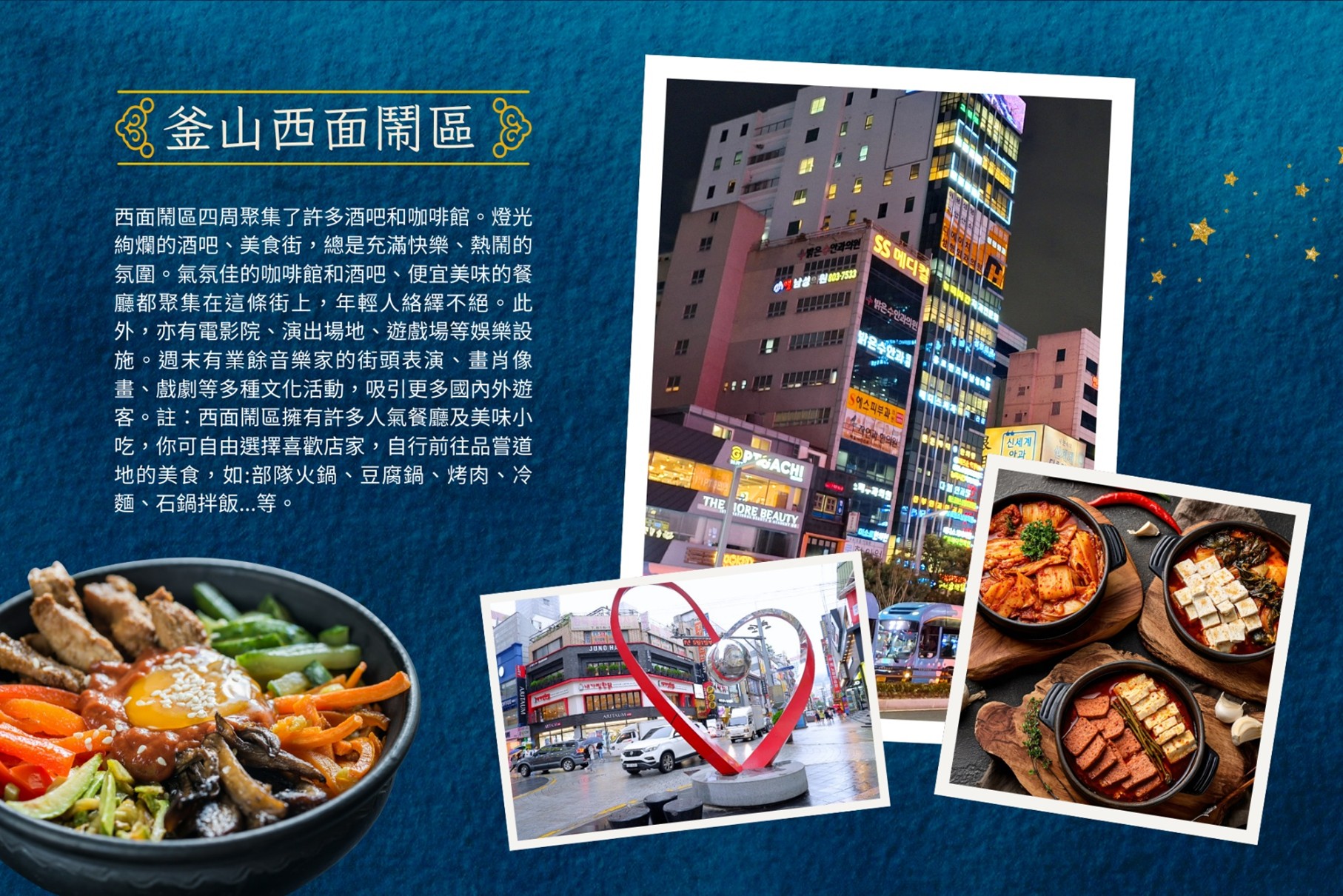 【釜山西面鬧區(美食大探索)】西面鬧區四周聚集了許多酒吧和咖啡館。燈光絢爛的酒吧、美食街,總是充滿快樂、熱鬧的氛圍。氣氛佳的咖啡館和酒吧、便宜美味的餐廳都聚集在這條街上,年輕人絡繹不絕。此外,亦有電影院、演出場地、遊戲場等娛樂設施。週末有業餘音樂家的街頭表演、畫肖像畫、戲劇等多種文化活動,吸引更多國內外遊客。註:西面鬧區擁有許多人氣餐廳及美味小吃,你可自由選擇喜歡店家,自行前往品嘗道地的美食,如:部隊火鍋、豆腐鍋、烤肉、冷麵、石鍋拌飯...等。