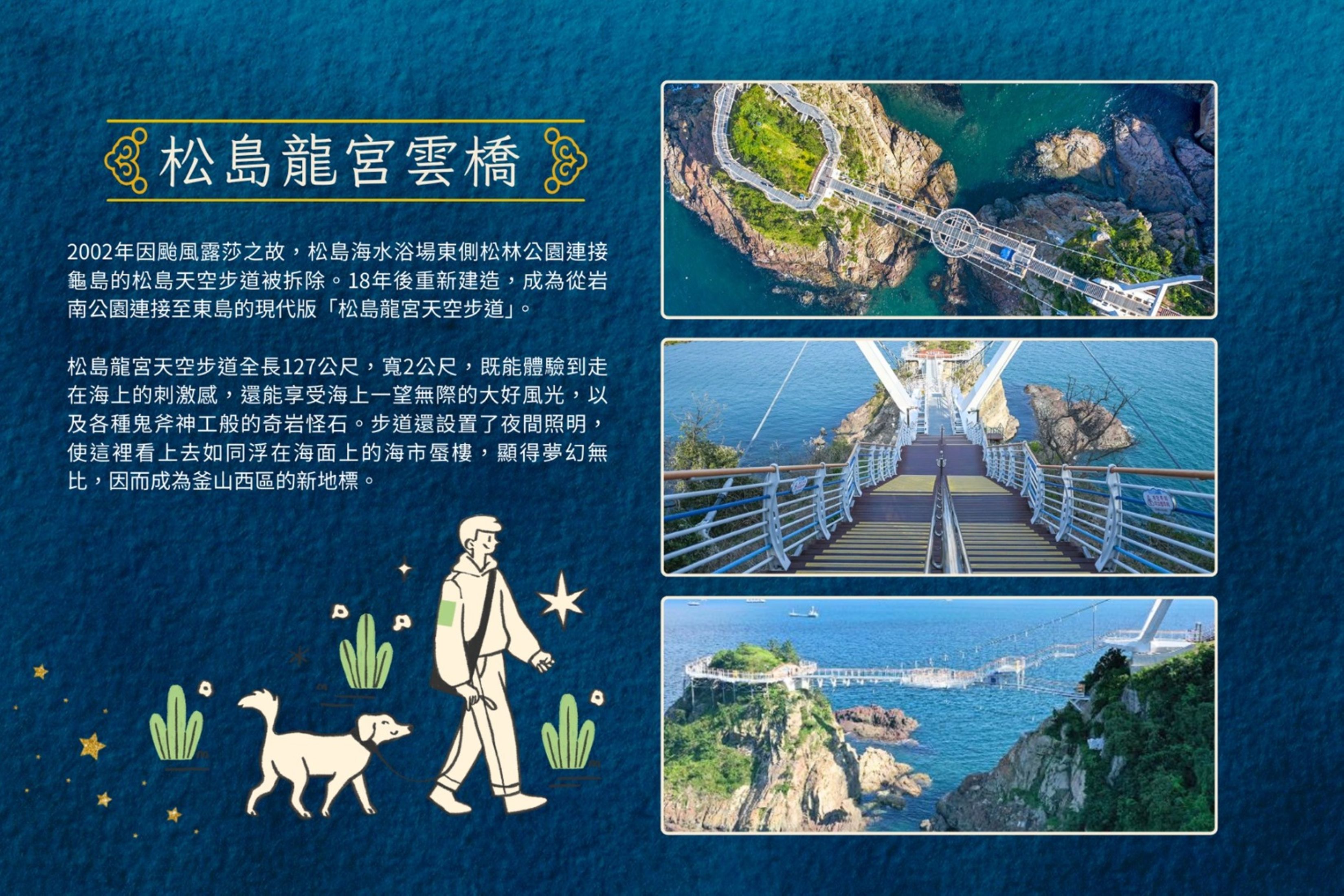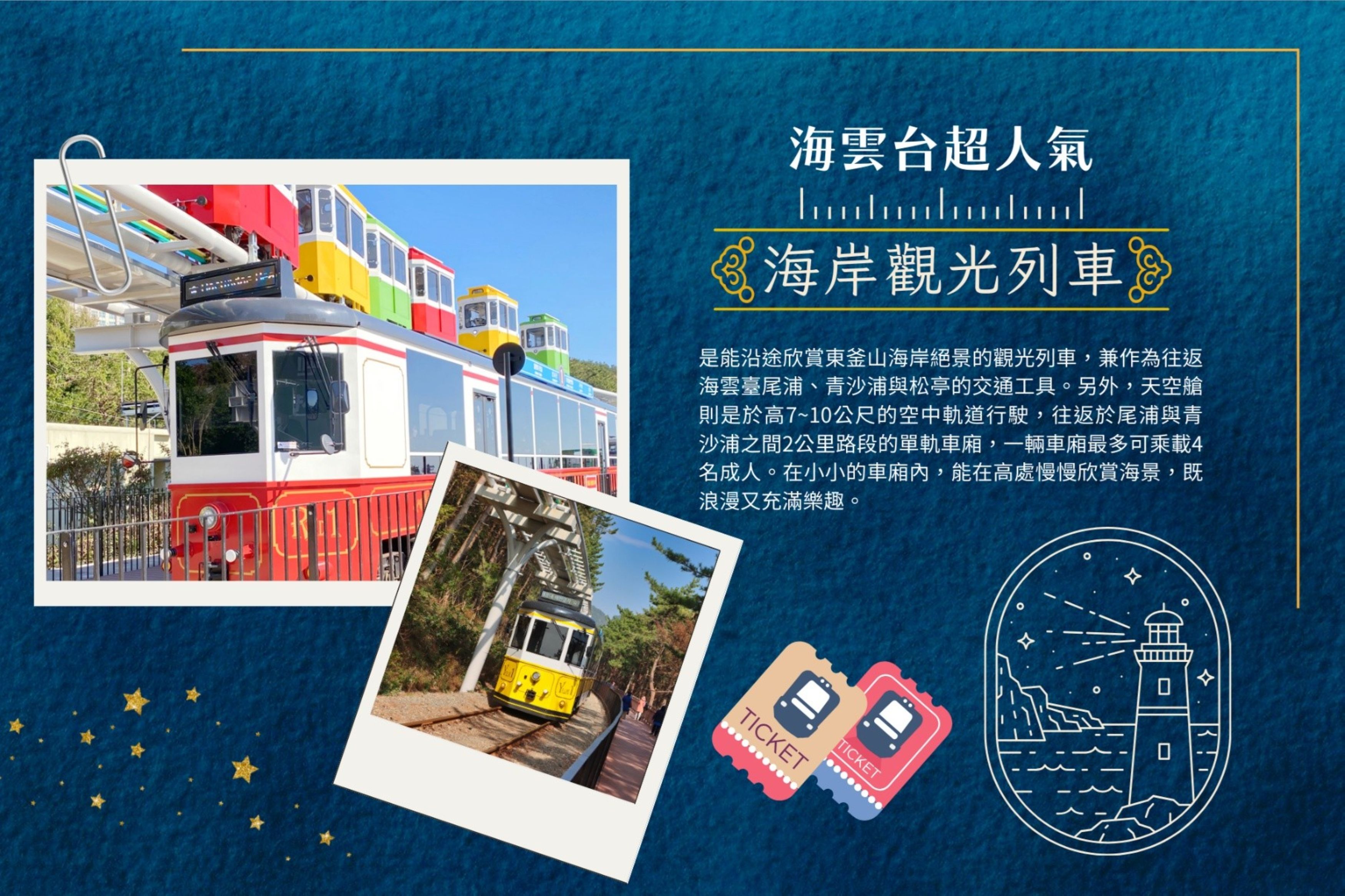 釜山海雲台藍線公園 BLUE LINE PARK海岸列車➠青沙浦墊腳石展望台 + 紅白燈塔➠櫻木花道平交道➠松島纜車(單程) ➠松島龍宮雲橋➠西面鬧區