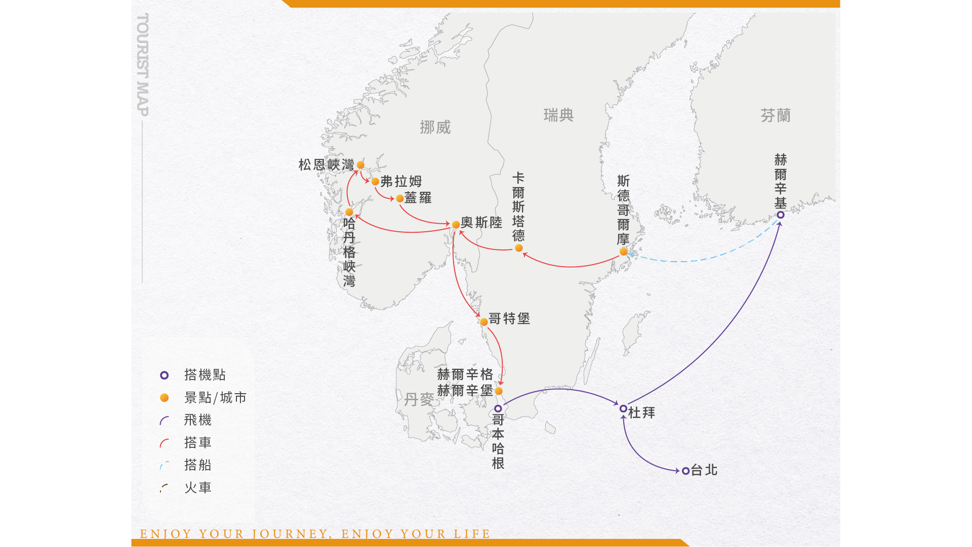 近晚從容的收拾行囊,並帶著滿滿回憶,專車前往機場辦理登機手續,搭機返回台灣。此趟旅程呈現給您的想必是另外一種特別的體驗,就讓我們帶著美好的回憶與旅途中的戰利品,結束這趟難忘的北歐之旅。