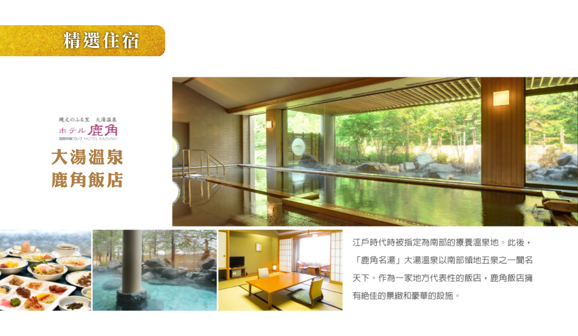 【鹿角溫泉】鹿角溫泉擁有豐富的自然資源,特別是以其療癒效果顯著的溫泉水聞名,深受遊客和當地居民的喜愛。該地的溫泉水質清澈,富含多種對皮膚及健康有益的礦物質,被認為對舒緩筋骨疼痛、改善血液循環等有很好的效果。