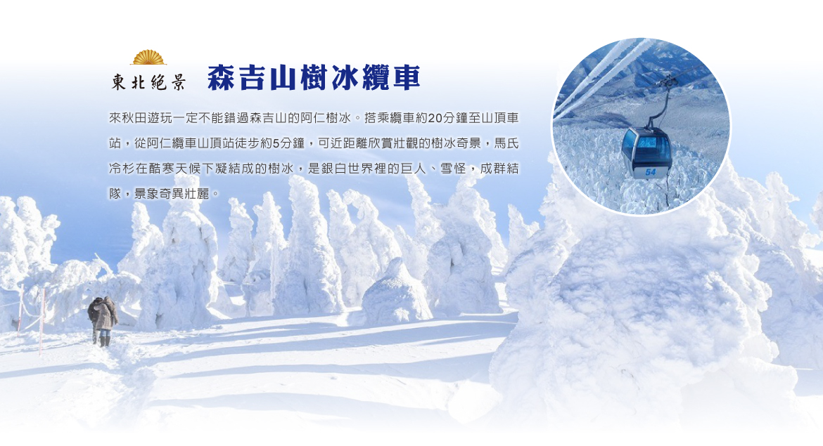 【森吉山樹冰】樹冰是日本東北地方特有的奇景,來自西伯利亞的寒風夾帶大量水氣,在迎風山坡的松樹上凝結成冰霜,一層又一層地包覆住變成巨大的白色神秘物體,如深山中的怪物一般,因此樹冰又有雪怪之稱。這種特殊的自然景觀可不是到處都觀賞的到,因此來秋田遊玩一定不能錯過森吉山的阿仁樹冰。搭乘纜車約20分鐘至山頂車站,從阿仁纜車山頂站徒步約5分鐘,可近距離欣賞壯觀的樹冰奇景,馬氏冷杉在酷寒天候下凝結成的樹冰,是銀白世界裡的巨人、雪怪,成群結隊,景象奇異壯麗。