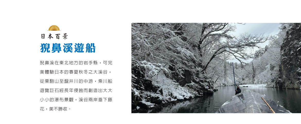 【猊鼻溪輕舟】是著名的峽谷景勝地,全長約兩公里,由砂鐵川切割而成,兩岸峭壁高達百餘公尺,奇岩怪石林立,隨四季展現不同景色。特別安排「猊鼻溪輕舟遊覽」,由船夫以長竿掌舵,帶領遊客順流而下再逆流而返,全程約九十分鐘,航程中船夫不僅介紹沿途地形與岩壁名稱,還會吟唱傳統民謠,讓旅人感受當地文化魅力。