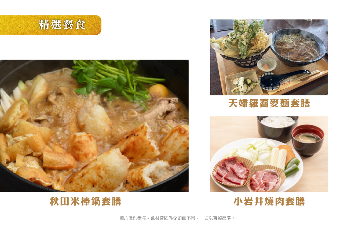 早餐:飯店內享用 午餐:秋田米棒鍋御膳 或 日式風味餐 晚餐:飯店內自助餐或宴會餐