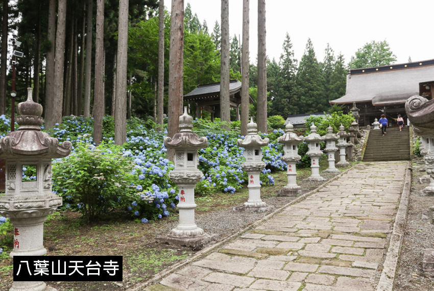 【八葉山天台寺】(繡球花預估時間6月下旬~7月下旬)隸屬天台宗,相傳創建於平安時代,擁有深厚的宗教與文化背景,是東北地區歷史悠久的佛教寺院之一。寺院坐落於山林之中,環境清幽,被自然景觀環繞,自古以來便是修行與祈福的重要場所。寺院境內與參道周邊種植大量繡球花,盛開時藍紫、粉色花朵與古寺建築、山林景色相互映襯,氣氛清幽典雅。