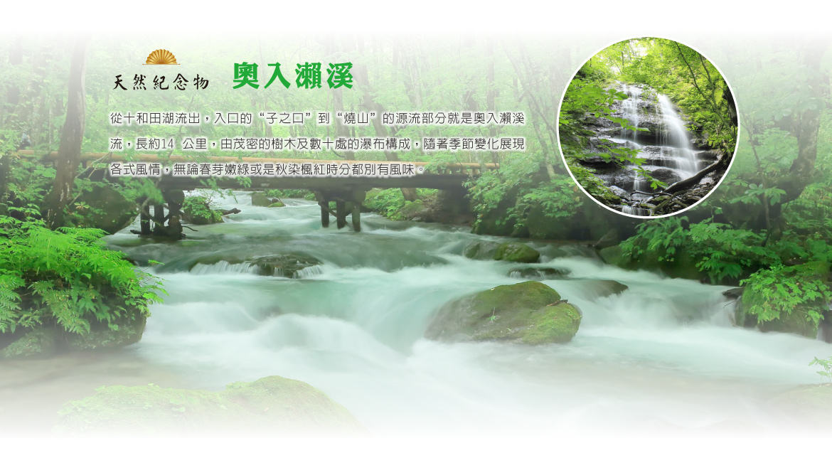 【奧入瀨溪流】是一條全長約14公里長的溪流,有壯觀的瀑布、清流小溪等眾多美麗景觀,沿途風景完全不經人工種植皆為自然造景,被指定為國家特別名勝與天然紀念物。昔日詩人大町桂月曾到此一遊驚嘆「居必日本,遊必十和田湖,行必奧入瀨溪三里半」,道盡十和田湖與奧入瀨溪極致的美景。