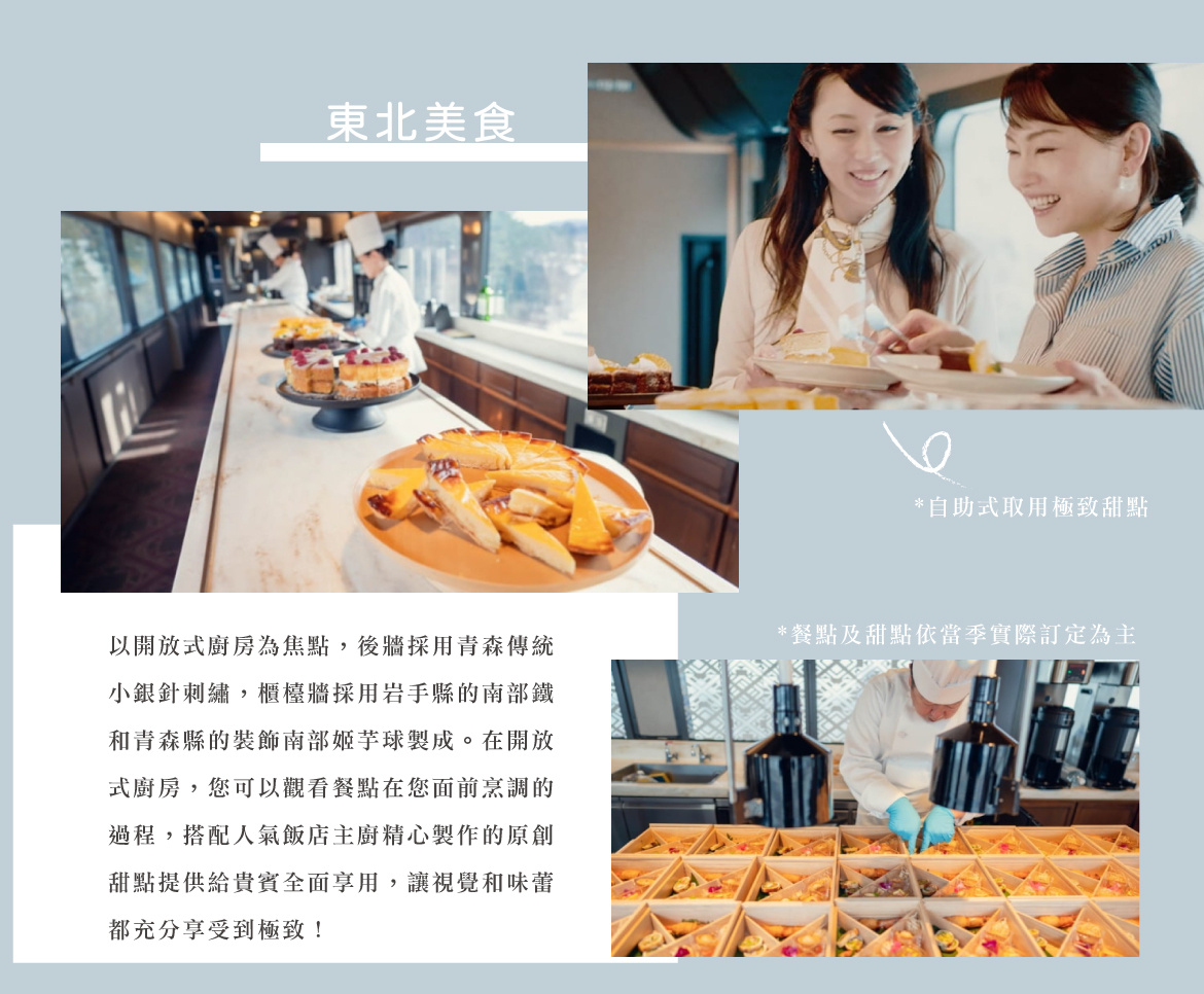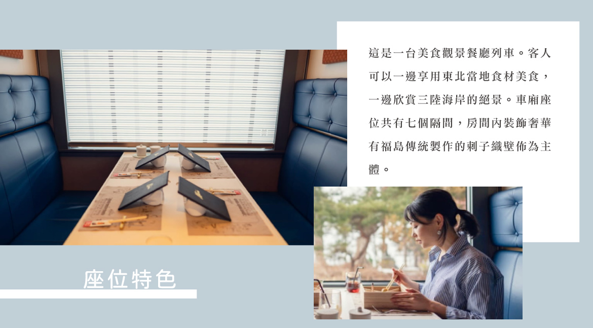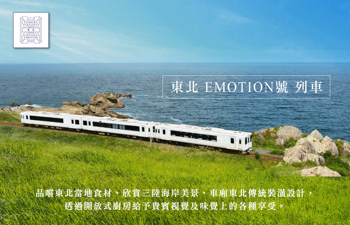 【東北愉快EMOTION列車】是一輛以觀光、美食為主題的夢幻列車,將設計、美食、藝術與自然風景完美融合,每節車廂的內裝設計皆融合東北各地的傳統工藝精髓,如福島的「刺子織」、青森的「津輕小巾刺繡」、岩手的「南部鐵器」等,從燈光、桌飾到牆面紋理,每一處細節都藏著東北的文化氣息。列車上搭載開放式廚房,乘客可一邊欣賞太平洋海岸及山巒景色,一邊細細品嚐由專業料理團隊現場烹調、嚴選東北在地食材打造的創意料理,讓旅客享受一場融合視覺、味覺與文化的多感官特色體驗。
