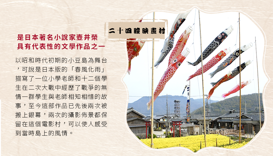 是由1987年拍攝由日本名作家「壺井榮」所寫,有日本版「春風化雨」之稱的名小說『二十四之瞳』翻拍電影時使用的外景地改建而成的,還保存了當時拍攝的場景,以及劇中老師與學生的雕像。這裏有非常真實的木結構分教場(校舍)、男老師家的房子、漁夫家的房子、茶館等。電影描述發生在小豆島上的師生之情感人肺俯的故事,曾經2度被搬上大螢幕,造成極大的轟動及廻響。