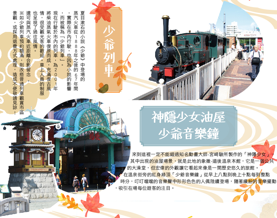 來到這裡一定要來參觀著名的道後公共溫泉湯屋,這外形是不是和宮崎駿動晝片「神隱少女」油湯場景非常相似呢?雖然在這已看不到湯婆婆、千尋的身影但造型之相似總讓人感動到會心一笑;在溫泉街旁的紅身綠頂『少爺音樂鐘』從早上八點到晚上十點每到整點時分,在叮叮噹噹的音樂聲中形形色色的人偶陸續登場隨著繽。