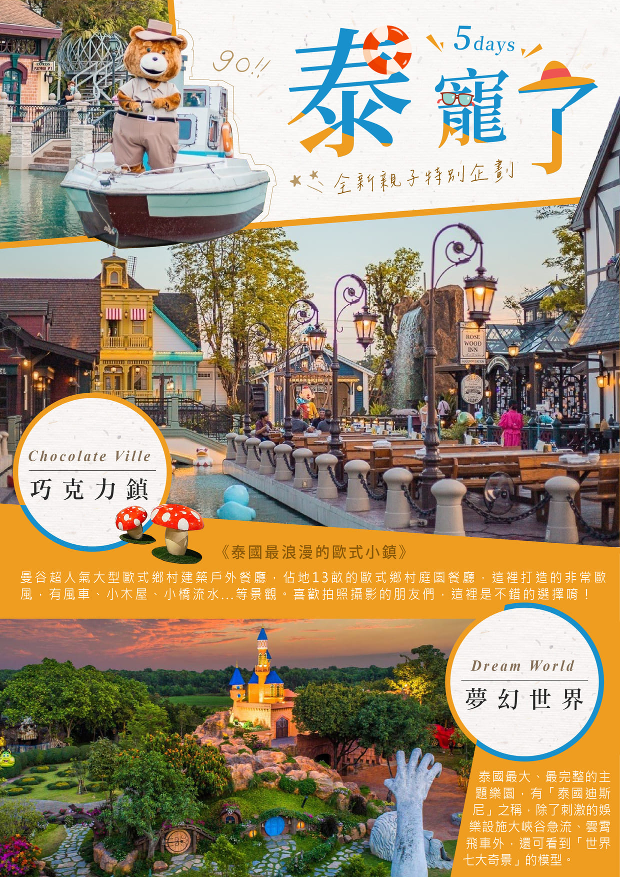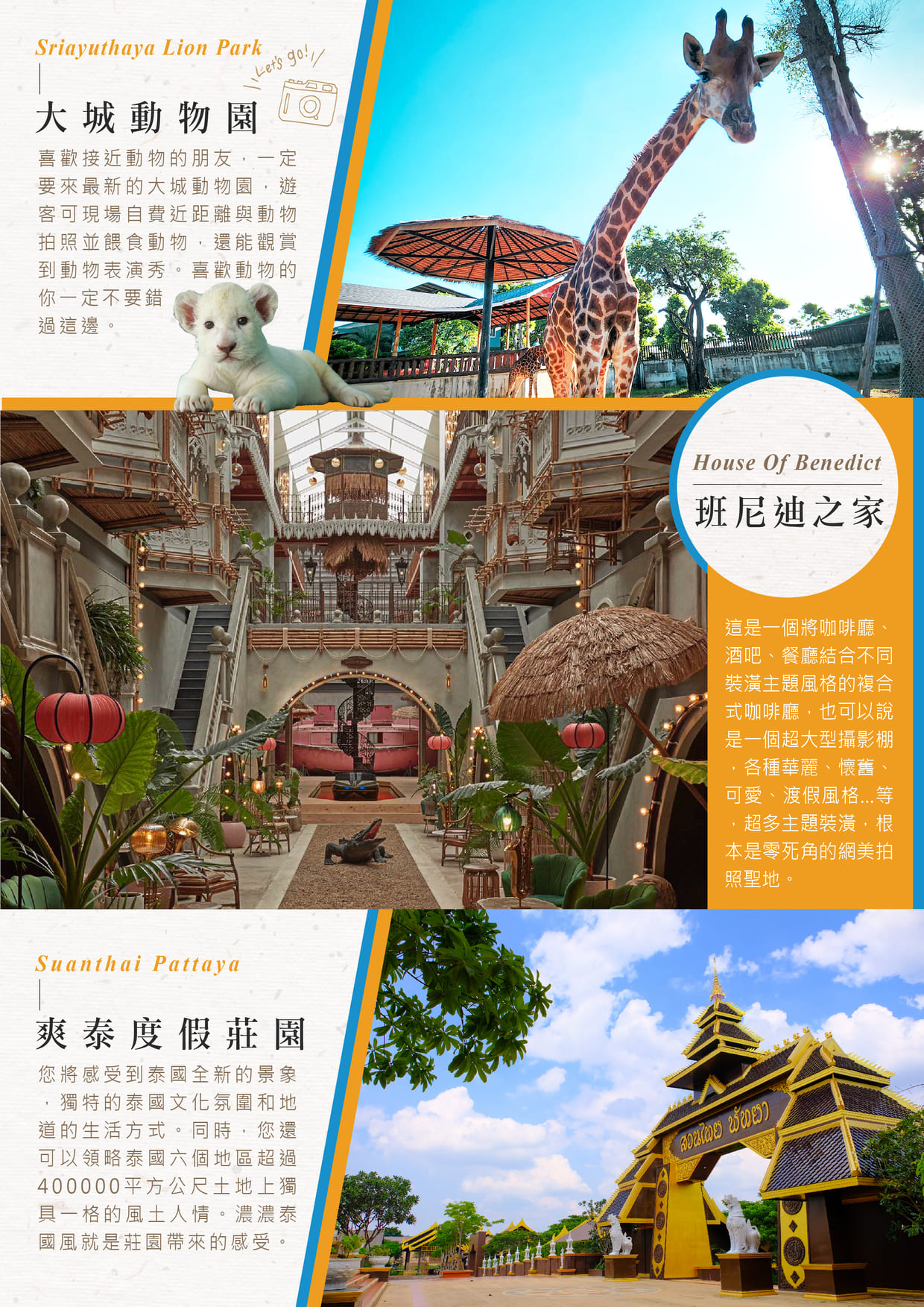 ◆爽泰渡假莊園10合1:2023年重新開幕的泰式莊園,您將感受到泰國全新的景象,獨特的泰國文化氛圍和地道的生活方式。同時,您還可以領略泰國六個地區超過400000平方公尺土地上獨具一格的風土人情。濃濃泰國風就是莊園帶來的感受,特別安排泰式傳統服裝體驗,以及船遊水上市場,再來體驗泰國特有節慶宋干節與水燈節,以為這樣就結束了嗎?還有可愛大象和馬車等著貴客蒞臨,這麼特別的旅遊經驗,就是要讓您上傳照片打卡,羨煞親朋好友!