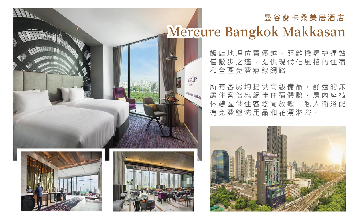 住宿:Mercure Bangkok Makkasan 或 或A ONE BANGKOK 或同等級