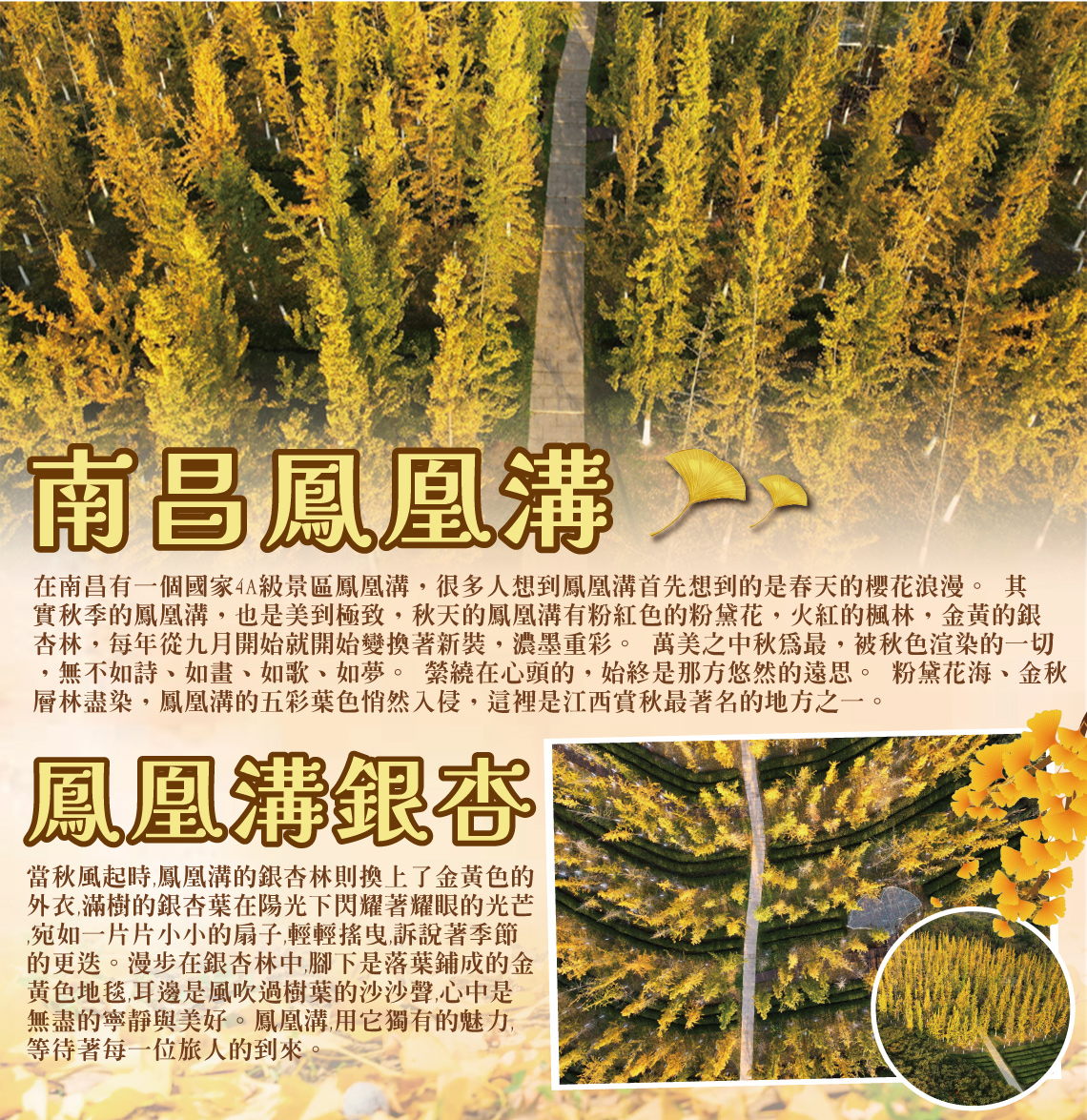 走近南昌鳳凰溝景區,這裡是大自然賦予的詩意田園,進入園區,首先映入眼簾的是那一片片翠綠的茶田,宛如一塊塊巨大的翡翠鑲嵌在大地上,茶香四溢,讓人不由自主地深呼吸,彷彿能吸進滿滿的清新與寧靜。 漫步向前,便是絢爛多彩的花海,各種花卉爭奇鬥艷,紅的如火,粉的似霞,白的勝雪,黃的若金,宛如一幅絢麗多彩的畫卷鋪展在眼前。春風吹過,花香撲鼻,讓人沉醉其中。 而當秋風起時,鳳凰溝的銀杏林則換上了金黃色的外衣,滿樹的銀杏葉在陽光下閃耀著耀眼的光芒,宛如一片片小小的扇子,輕輕搖曳,訴說著季節的更迭。漫步在銀杏林中,腳下是落葉鋪成的金黃色地毯,耳邊是風吹過樹葉的沙沙聲,心中是無盡的寧靜與美好。鳳凰溝,用它獨有的魅力,等待著每一位旅人的到來。