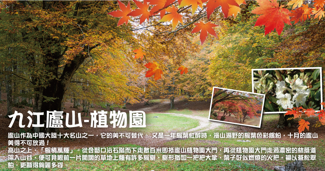 【花徑賞楓】花徑相傳是唐代詩人白居易詠詩《大林寺桃花》的地方。白居易被貶任江州(九江)司馬時,曾來廬山遊覽,當時正值暮春,白居易有感於山下桃花已落而此處桃花仍盛開,吟道:“人間四月芳菲盡,山寺桃花始盛開”。行走在廬山花徑公園面積約1000餘平方米的楓園內,眼望著雲騰霧漫光柱,感受著風吹樹動葉落,塵囂似乎凝固,沒有冷落清秋節,忽生鼎沸熱愛心。那一片片飄散而逝的彩色精靈,仿佛告訴人們“落紅不是無情物,化作春泥更護花”的詩中哲理。