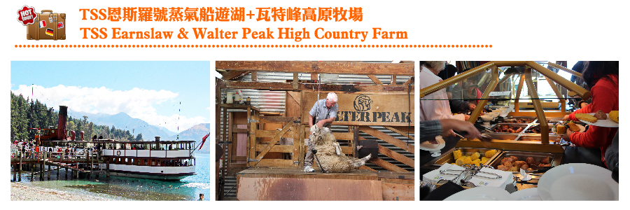 【古董蒸汽船遊湖+瓦特峰高原農莊】搭乘19世紀的TSS恩斯羅號古董蒸汽船,暢遊景色秀麗絕美的瓦卡蒂普湖,到對岸下船後登上瓦特峰農莊,瓦爾特峰高原農場位於美麗的瓦卡蒂普湖的西岸,在湖光山色的環境中讓你感受紐西蘭的鄉村生活。抵達瓦特峰牧場後,參加牧場遊覽活動。帶您步行參觀牧場,親身體驗紐西蘭的鄉村生活。我們也會解釋傳統的農牧方式,以及各種動物的重要性。您可以幫著給綿羊餵食,近距離觀看鹿和蘇格蘭高地牛。觀看忙忙碌碌的牧羊犬,參觀剪羊毛的過程,也許你可以親手嘗試一下紡羊毛線的滋味。如有時間可在湖濱花園裡散步,步入迷人的上校農莊餐館(Colonel’s Homestead)面對湖光山色享用農莊BBQ午餐。