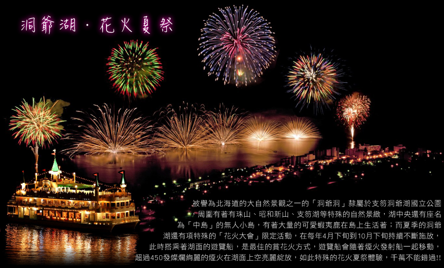 洞爺湖是因火山噴發陷落而形成的湖泊,周遭火山運動活絡,有珠山、昭和新山不斷冒出濃濃白煙,氣勢磅礡攝人,而引爆洞爺湖夏季狂歡的最高潮,當然就是花火大會了。洞爺湖花火大會於4/28~10/31,每個晚上都由花火施放船到各個溫泉飯店前施放煙火,似乎在歡迎著觀光客來到,這也成為洞爺湖最具特色的觀光項目,花火大會是日本人最愛的慶典節目了,在洞爺湖溫泉更是發揮得淋漓盡致,這也成為洞爺湖最具特色的觀光項目。
