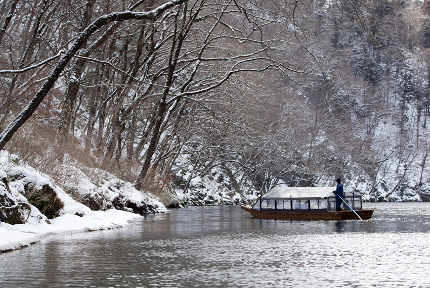 【猊鼻溪輕舟】是著名的峽谷景勝地,全長約兩公里,由砂鐵川切割而成,兩岸峭壁高達百餘公尺,奇岩怪石林立,隨四季展現不同景色。特別安排「猊鼻溪輕舟遊覽」,由船夫以長竿掌舵,帶領遊客順流而下再逆流而返,全程約九十分鐘,航程中船夫不僅介紹沿途地形與岩壁名稱,還會吟唱傳統民謠,讓旅人感受當地文化魅力。