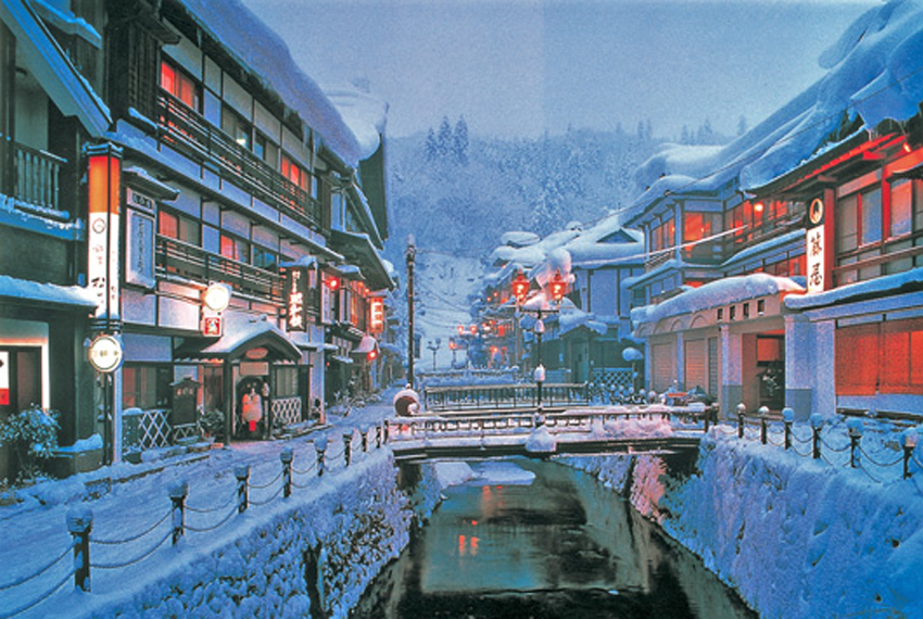 【銀山溫泉】充滿日式懷舊風情的溫泉鄉銀山溫泉,這裡擁有美麗的自然景色,大量保留大正時代建築風格的老式建築,處處散發著浪漫氣息。這裡一年四季都有不同的美景,在漫長的夏日午後,可以隨意穿著浴衣,在田園詩意的街頭慵懶漫步;冬季皚皚白雪覆於屋宇,煤氣燈的柔光更顯迷離,令人久久不能忘懷。