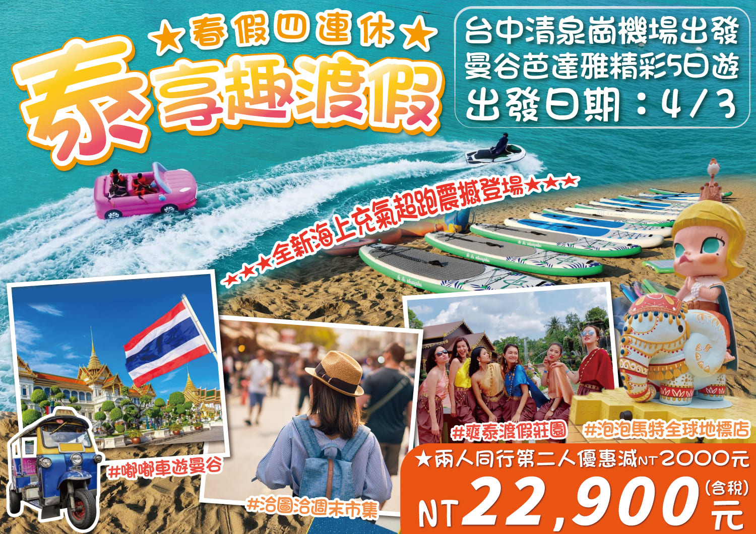 春假四連休~泰享趣渡假【泰國曼谷芭達雅5日遊】彩虹沙灘俱樂部.爽泰渡假莊園.洽圖洽週末市集.朱拉隆功美食一條街