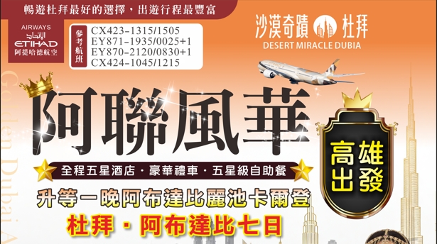 高雄出發 | 阿提哈德航空 | 阿聯風華杜拜、阿布達比7日-3.4月限定~沙漠衝沙、阿布達比五星酒店